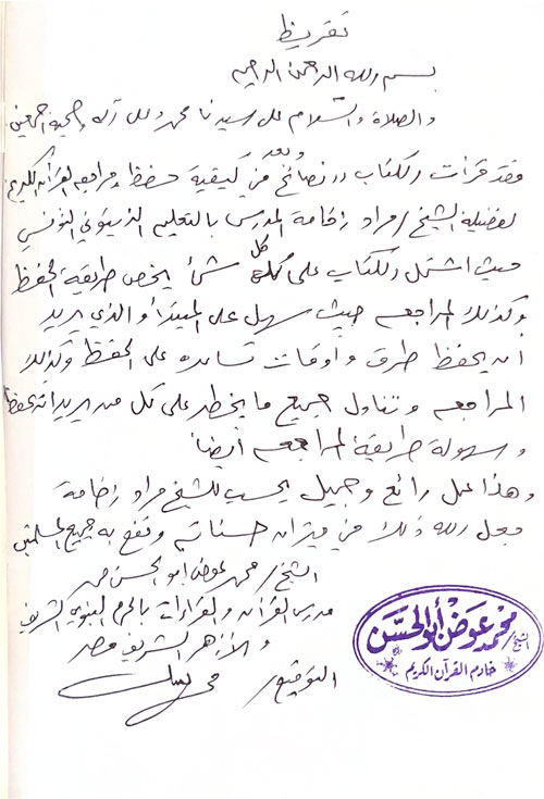 الحمد لله الرّحمــٰن الرّحيم الكريم المنّان، الّذي علّم القرءان، والصّلاة والسّلام على خير الأنام، الّذي أوصى بِتَعَهُّدِ الْفُرْقَانِ، محمّد رسول الله سيّد ولد عدنان، وعلى آله وصحبه الكرام. أمّا بعد، فقد نظرت في جزء علميّ للأستاذ الفاضل المقرئ: مراد زخّامة، حفظه الله ونفع به – الموسوم ب”نصائح في كيفيّة حفظ ومراجعة القرءان الكريم” فَأَلْفَيْتَهُ سَهْلَ التَّنَاوُلِ، خَفِيفَ الْمَحْمَلِ، سَلِسَ الأُسْلُوبِ، دَقِيقَ الْعِبَارَةِ، يصل إلى الانتفاع به المبتدئ في علوم القرآن عامَّةً ومن .يَرُومُ تَرْسِيخَ حِفْظه للكتاب العزيز خَاصَّةَ. وقد راعى المؤلّف الجَانِبَ العَمَلِيَّ، وتجنّبَ الجانبَ النَّظَرِيَّ، كما أَرْشَدَ طالبَ الحفظِ إلى الإخلاص والدّعاء، ونَصَحَهُ بإِدَامَةِ النَّظَرِ، وَكَثْرَةِ التَّكْرَارِ، والتَّدَرُّجَ في حسن الأداء؛ فكان عمله هذا -على صغره- أدوات عَمَلِيَّة، لا أقول تنظيريّة- وأحسبه وُفِّقَ في ذلك إلى حَدٍّ كبيرٍ، فجزاه الله خيرا، ونفع بعلمه العباد، واللهَ أرجو أن يَجْزِيَهُ خَيْرَ جزاء وأوفاه.